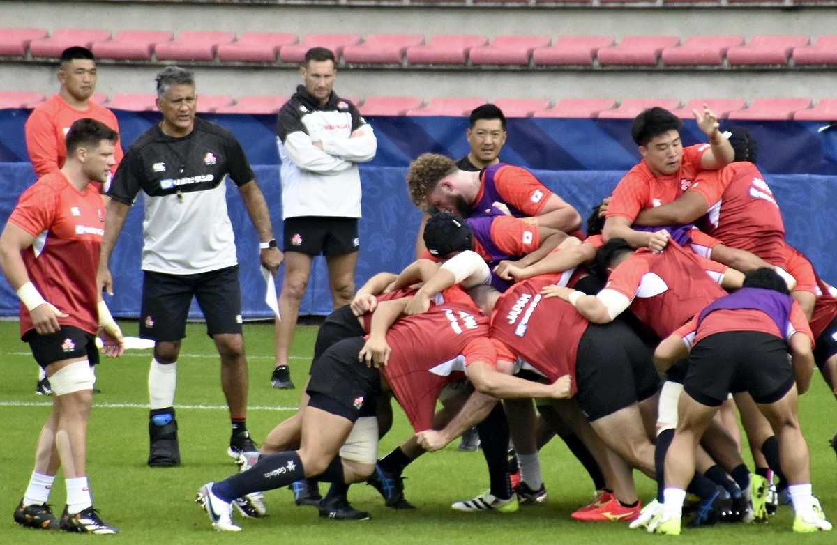 The Brave Blossoms’ forwards practiced scrums and mauls from lineouts during a training session open to the media in Toulouse, France, on Wednesday. England is renowned for playing a style of rugby that relies heavily on imposing physical dominance, but Japan assistant coach Shin Hasegawa, who is in charge of the team’s scrummaging, declared his forwards were up for the challenge.