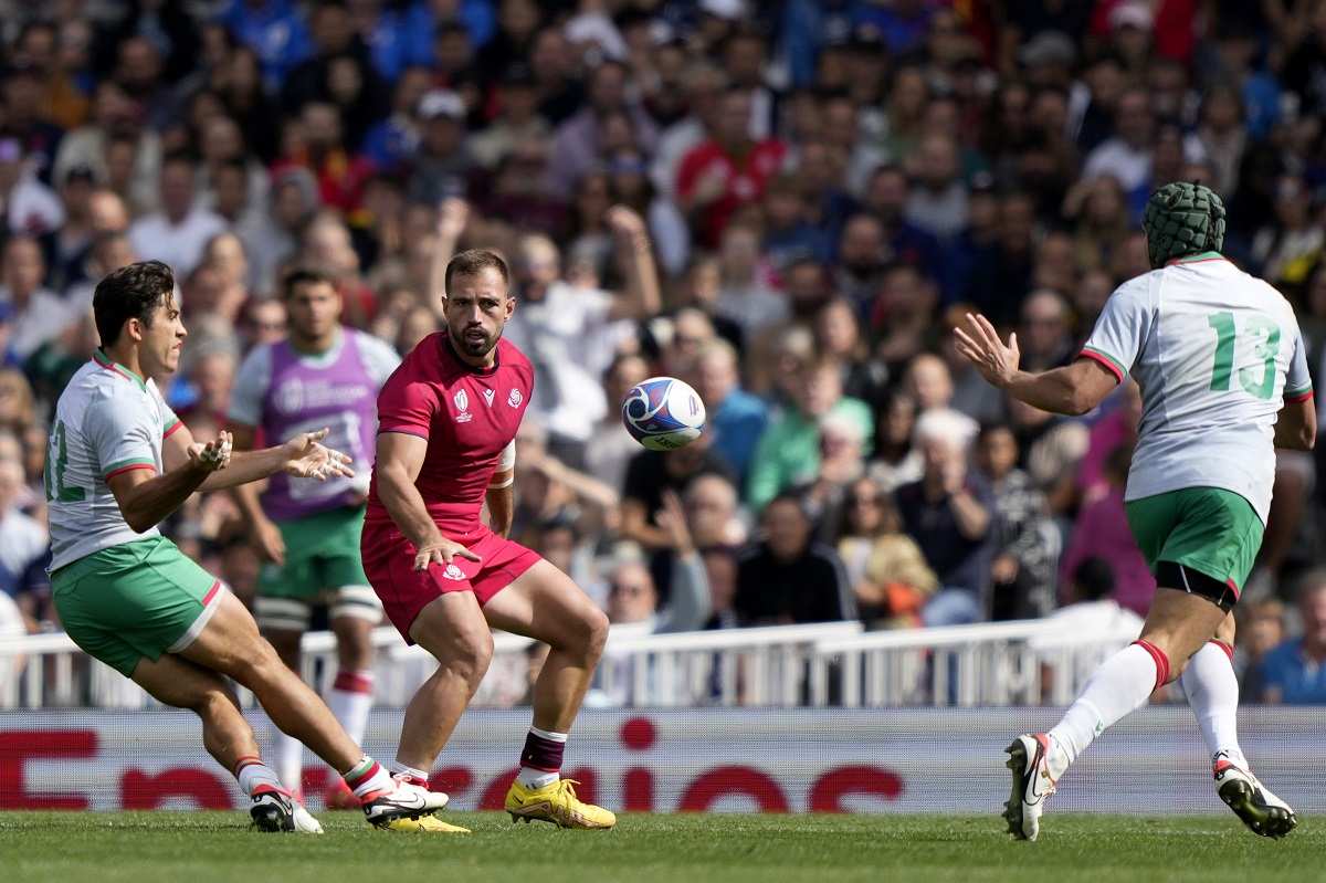 Georgia’s Merab Sharikadze, centre, looks on as Portugal’s Tomas Appleton, left, passes the ball during the Rugby World Cup Pool C match between Georgia and Portugal at the Stadium de Toulouse in Toulouse, France, Saturday, Sept. 23, 2023.
