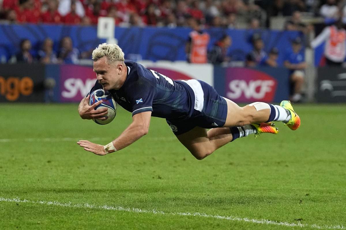 Scotland’s Darcy Graham scores a try during the Rugby World Cup Pool B match between Scotland and Tonga at the Stade de Nice, in Nice, Sunday, Sept. 24, 2023.