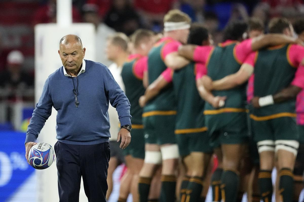 Australia’s head coach Eddie Jones holds a rugby ball during the warm-up before the Rugby World Cup Pool C match between Wales and Australia at the OL Stadium in Lyon, France, Sunday, Sept. 24, 2023.