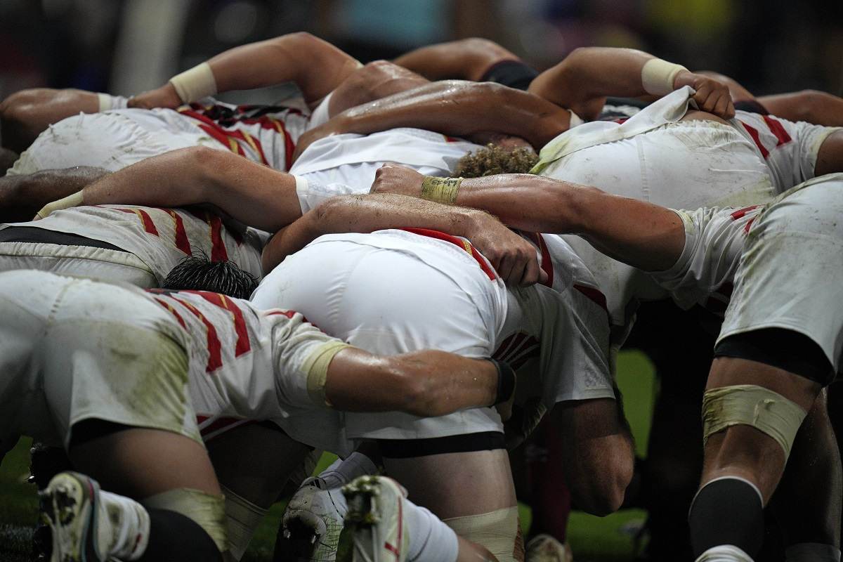 The Japan forward pack get ready for a scrum during the Rugby World Cup Pool D match between England and Japan in the Stade de Nice, in Nice, France Sunday, Sept. 17, 2023.