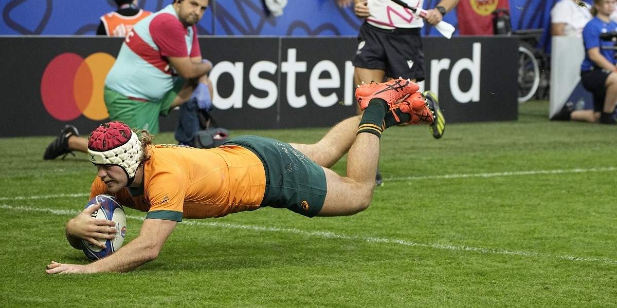 Australia’s Fraser McReight scores a try during the Rugby World Cup Pool C match between Australia and Portugal at the Stade Geoffroy Guichard in Saint-Etienne, France, Sunday, Oct. 1, 2023.
