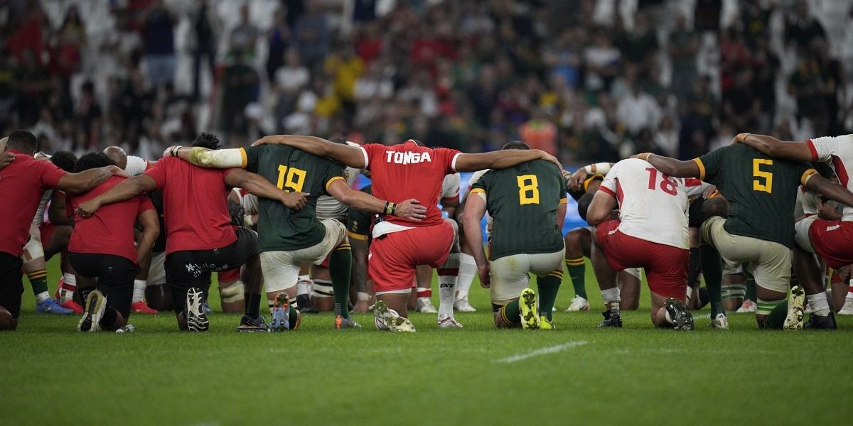 South Africa’s players form a huddle at the end of Rugby World Cup Pool B match between South Africa and Tonga at the Marseille’s Stade Velodrome, in Marseille, France Sunday, Oct. 1, 2023.