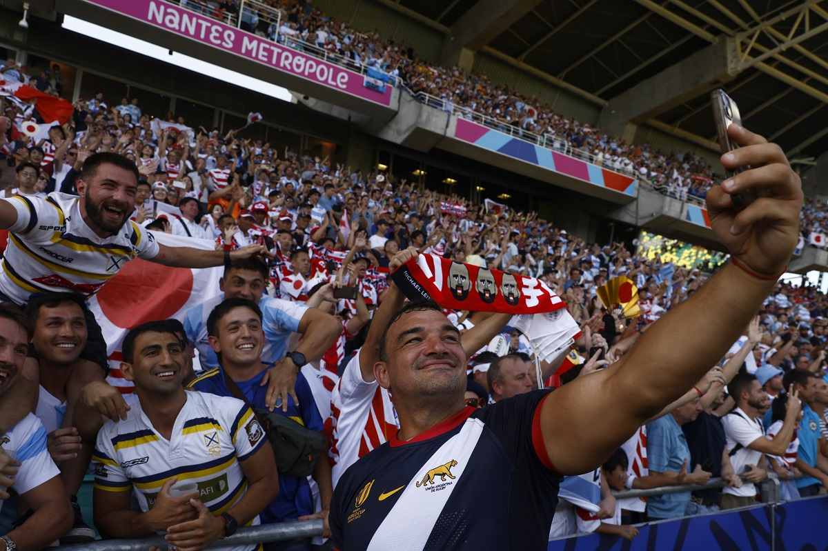Argentina’s Agustin Creevy takes a selfie with fans after the Rugby World Cup Pool D match between Japan and Argentina, at the Stade de la Beaujoire in Nantes, France, Sunday, Oct. 8, 2023.