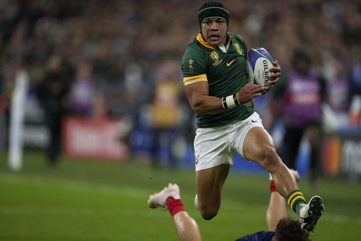 South Africa’s Cheslin Kolbe races to score his side’s third try during the Rugby World Cup quarterfinal match between France and South Africa at the Stade de France in Saint-Denis, near Paris Sunday, Oct. 15, 2023.
