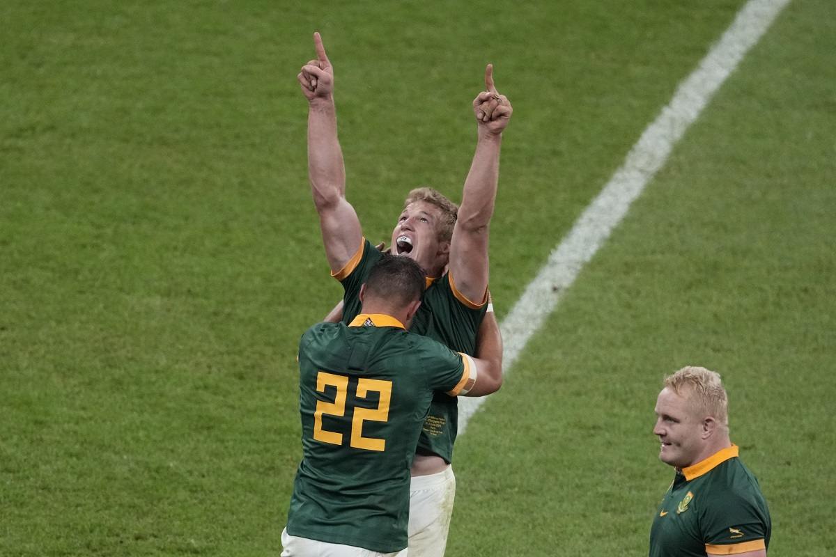 South Africa’s team players celebrate as they won the Rugby World Cup quarterfinal match between France and South Africa at the Stade de France in Saint-Denis, near Paris, Sunday, Oct. 15, 2023.