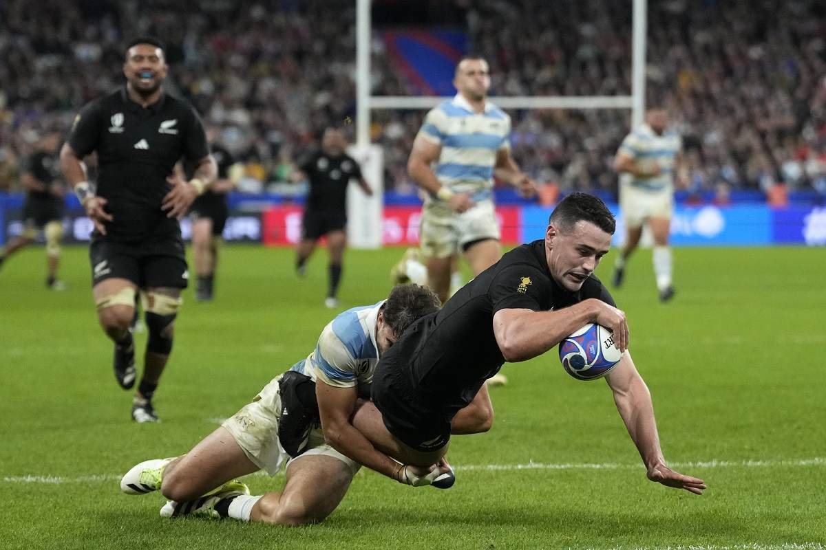 Argentina’s Juan Cruz Mallia, left, fails to stop New Zealand’s Will Jordan from scoring a try during the Rugby World Cup semifinal match in Saint-Denis, outside Paris, on Friday.