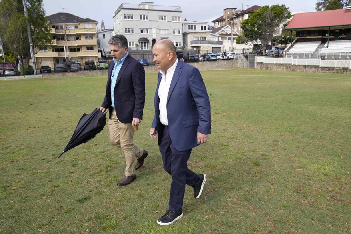 Australian Rugby’s head coach Eddie Jones, right, and Mark McCartney, head of communications for Rugby Australia, stroll on the pitch at Coogee Oval before Jones speaks to media in Sydney, Tuesday, Oct. 17, 2023.