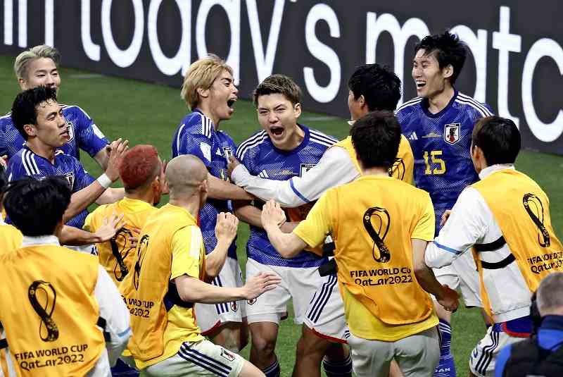 Japan players surround Ritsu Doan, center, after the midfielder scored an equalizer in World Cup Group E action against Germany in Doha on Wednesday.