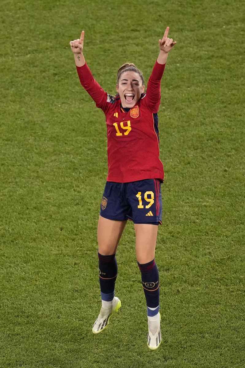 Spain’s Olga Carmona celebrates after her team’s victory over England during the Women’s World Cup soccer final at Stadium Australia in Sydney, Australia, Sunday, Aug. 20, 2023.