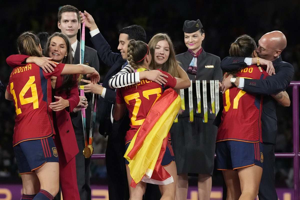 President of Spain’s soccer federation, Luis Rubiales, right, embraces Alba Redondo as Queen Letizia of Spain, second left, congratulates Laia Codina, and Princess Infanta Sofia embraces Athenea Del Castillo during the awards ceremony for the Women’s World Cup soccer final at Stadium Australia in Sydney, Australia, Sunday, Aug. 20, 2023.