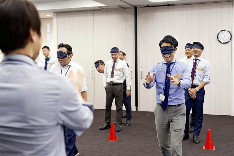 In the training sessions, participants wearing eye masks are divided into groups. They do such things as figuring out the number of people gathered in a certain spot, and experience the challenge of getting others wearing eye masks to act in line with their instructions.