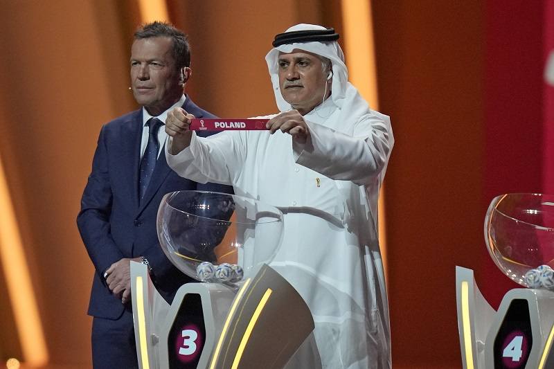 Former Qatari soccer international Adel Ahmed MalAllah holds up the name of Poland as he assists in the 2022 soccer World Cup draw at the Doha Exhibition and Convention Center in Doha on Friday.