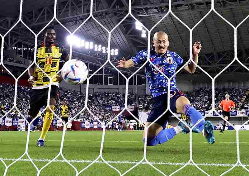 Japan’s Daizen Maeda gives his side its fourth goal during a friendly match against Ghana in Osaka on Friday.