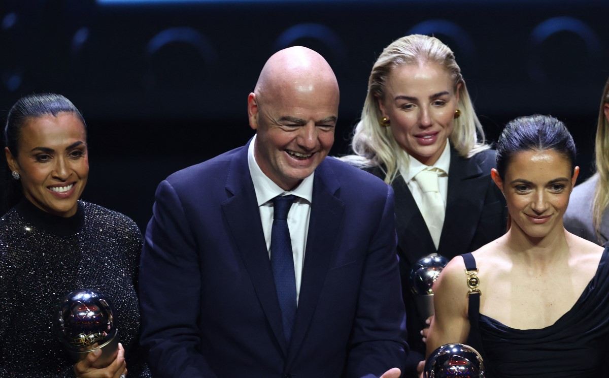 The Best FIFA Football Awards – Eventim Apollo, London, Britain – January 15, 2024 FIFA president Gianni Infantino poses on stage with Marta, Manchester City’s Alex Greenwood, FC Barcelona’s Aitana Bonmati, FC Barcelona’s Keira Walsh and Real Madrid’s Olga Carmona after the awards ceremony