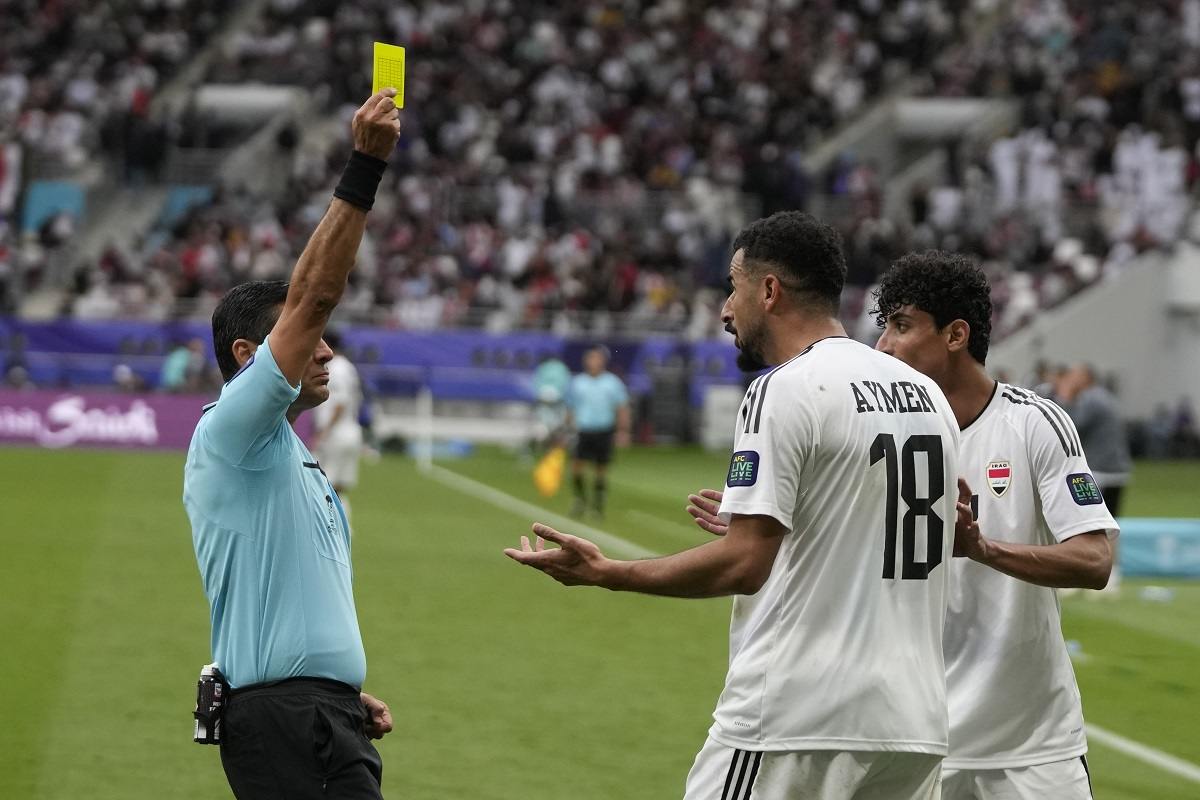Iraq’s Aymen Hussein is shown a second yellow card during the Asian Cup Round of 16 soccer match between Iraq and Jordan, at Khalifa International Stadium in Doha, Qatar, Monday, Jan. 29, 2024.