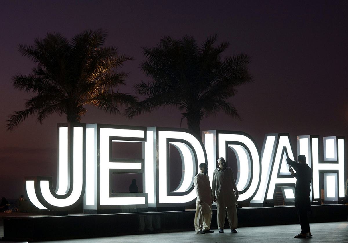Visitors pose for a picture at the Water Front Park in Jiddah, Saudi Arabia, on Jan. 15, 2020.