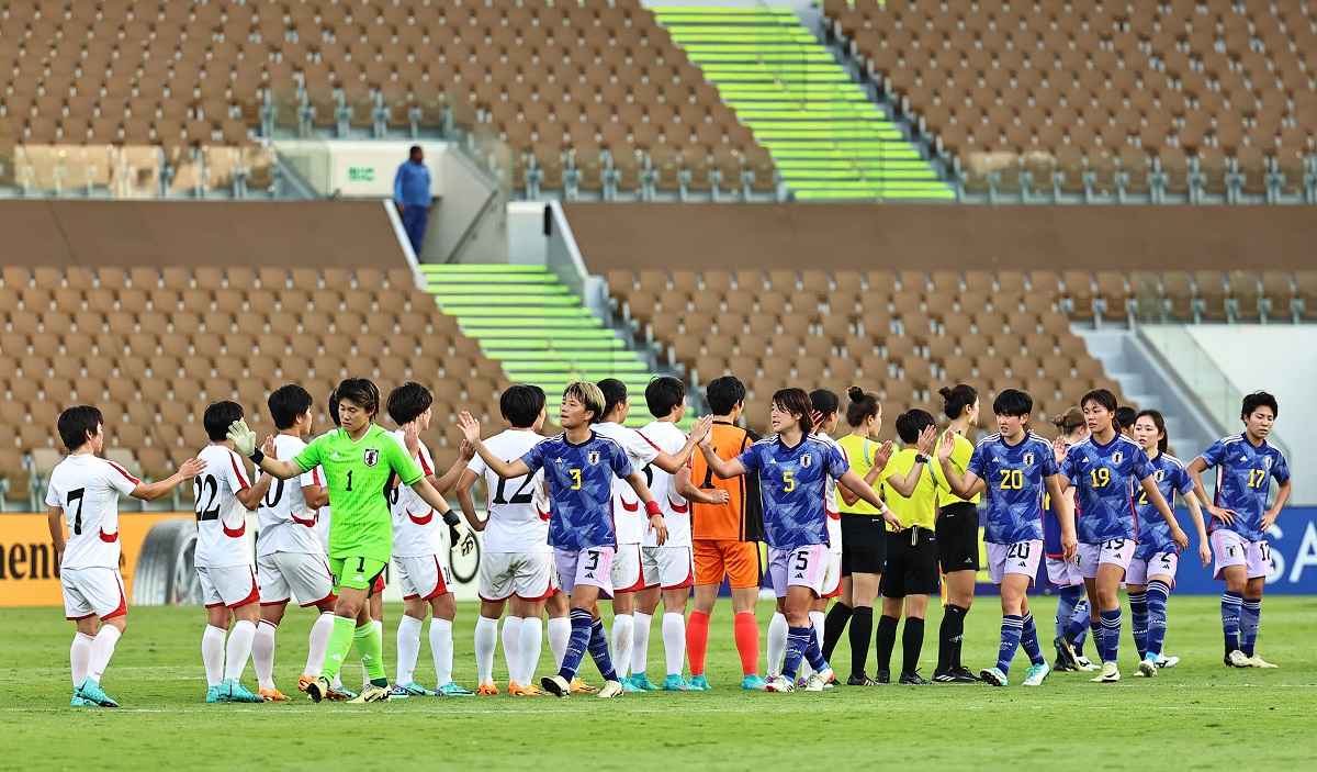 AFC Women’s Olympic Qualifiers – First Leg – North Korea v Japan – Prince Abdullah Al Faisal Stadium, Jeddah, Saudi Arabia – February 24, 2024 North Korea and Japan player shakes hands after the match