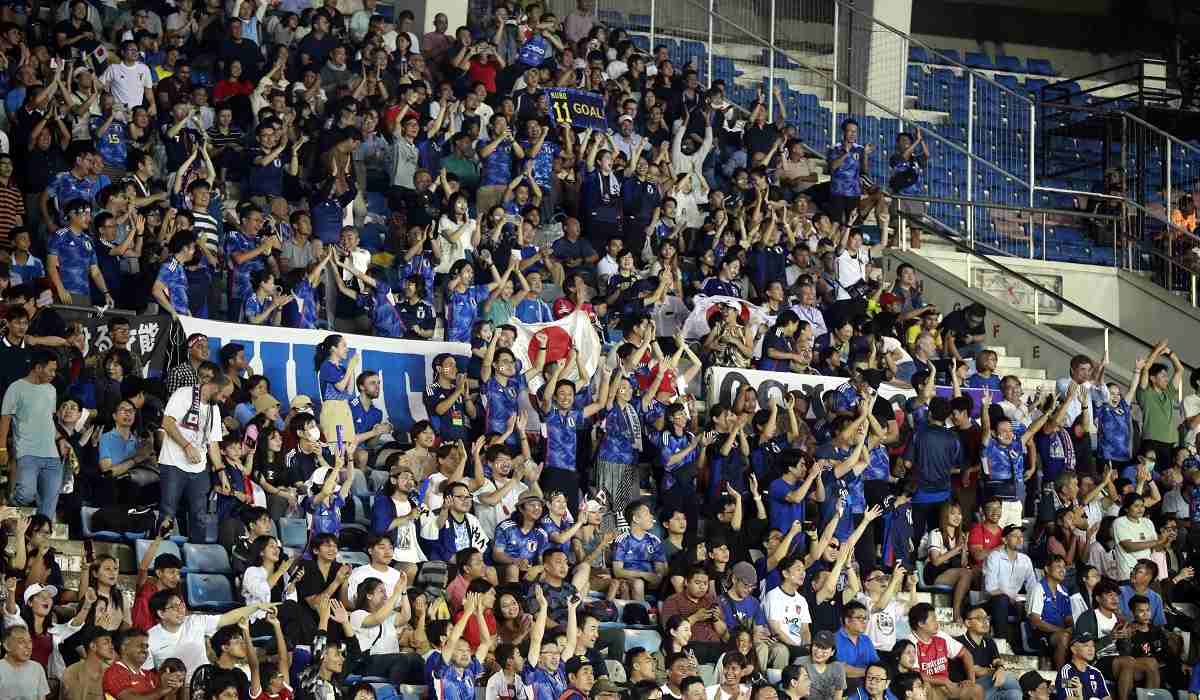 Japanese fans cheer as they watch Japan-Myanmar soccer match for 2026 World Cup Qualification AFC at Thuwunna stadium Thursday, June 6, 2024, in Yangon, Myanmar.