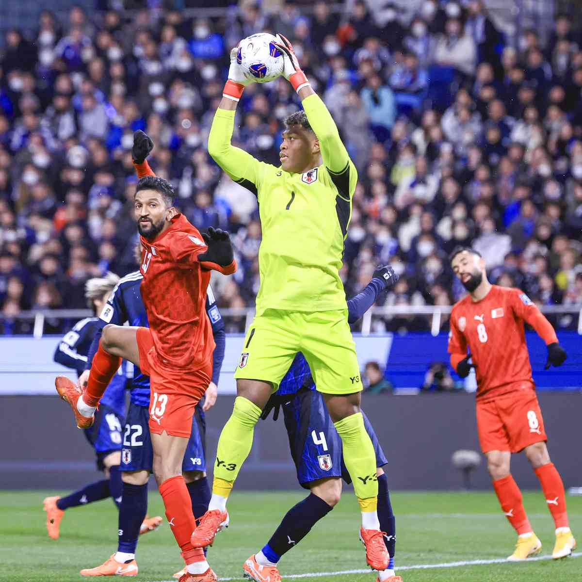 Goalkeeper Zion Suzuki claims the ball during the game against Bahrain.