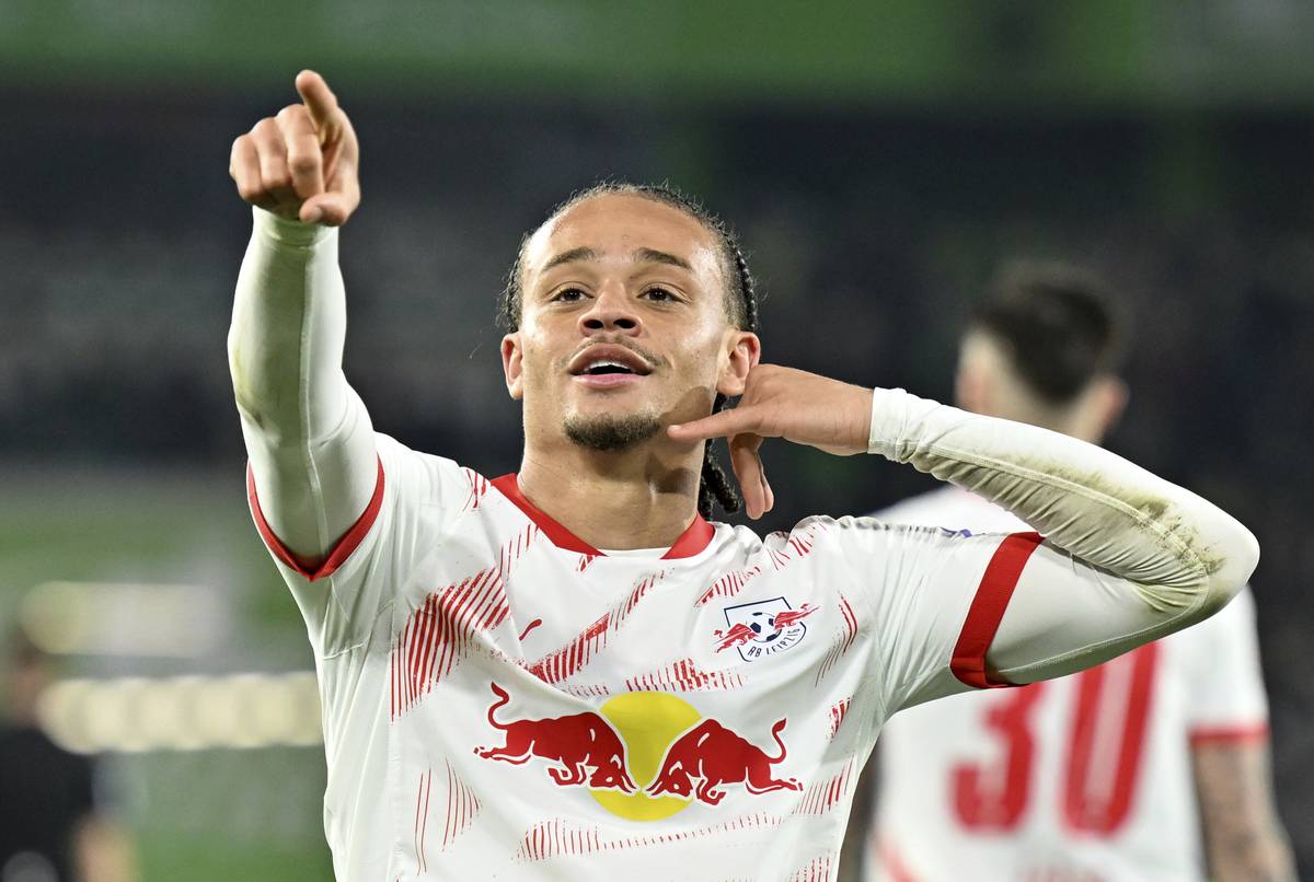 Leipzig’s Xavi Simons celebrates scoring during the Bundesliga soccer match between VfL Wolfsburg and RB Leipzig at Volkswagen Arena, Wolfsburg, Germany, Friday April 11, 2025.