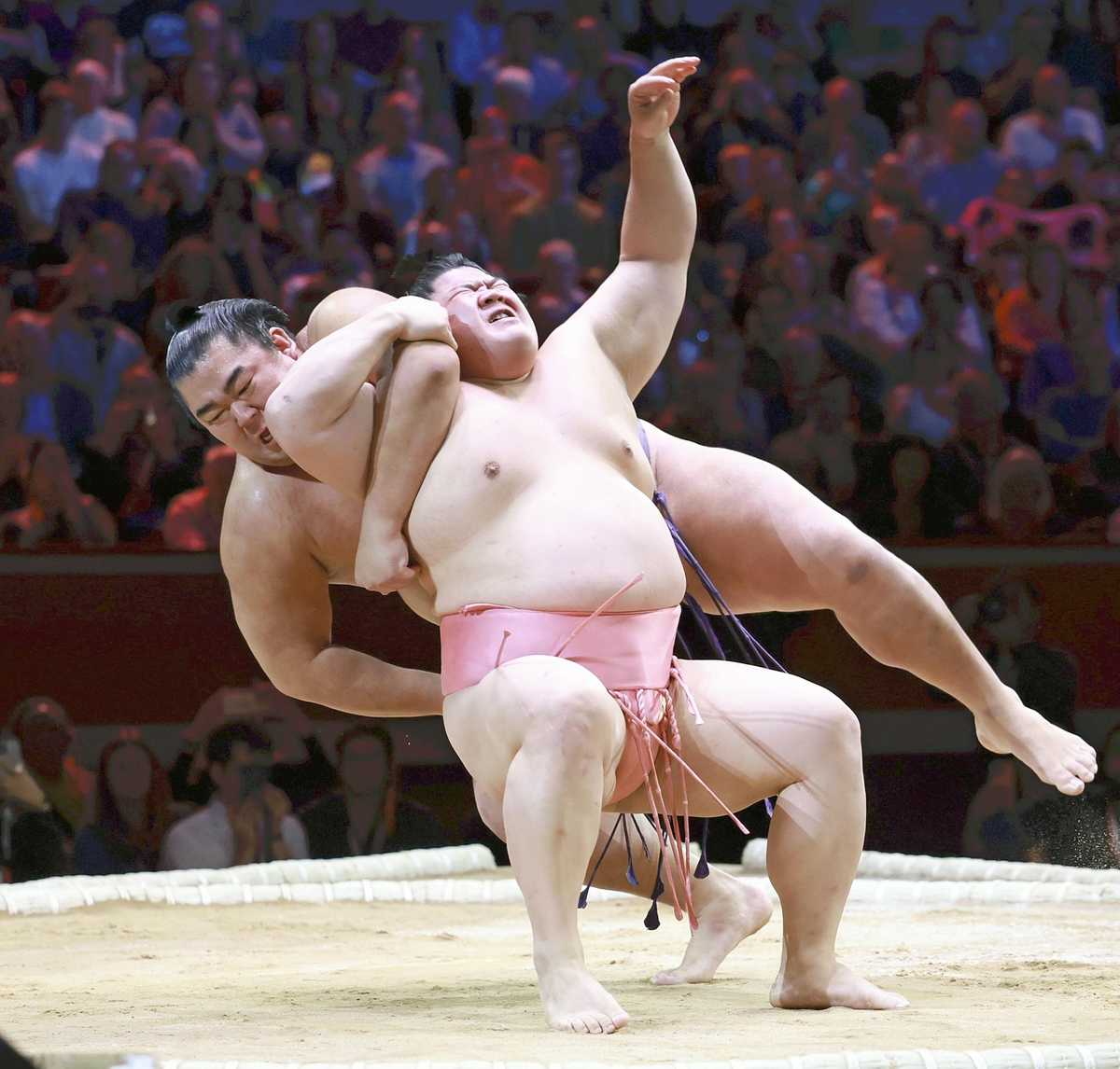 Ura, right, drops Shonannoumi on his back in London on Friday.