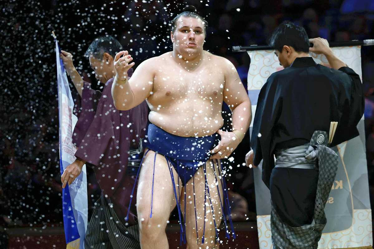 Aonishiki tosses salt onto the dohyo prior to a match at the Grand Sumo Tournament in London on Oct. 18.