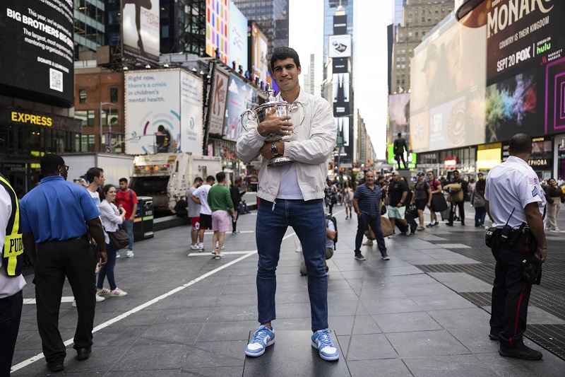 U.S. Open men’s singles tennis champion Carlos Alcaraz poses in Times Square, Monday, Sept. 12, 2022, in New York.