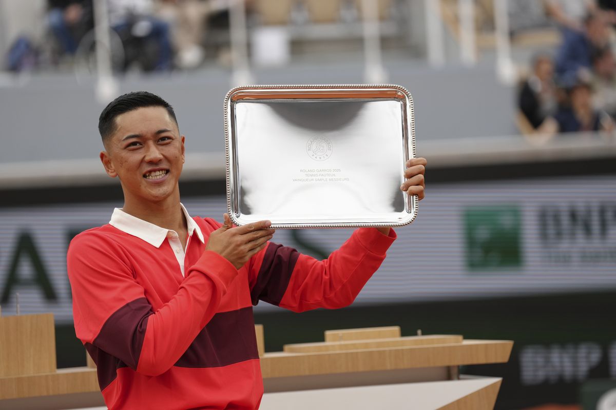 Japan’s Tokito Oda poses with the trophy as he won the men’s wheelchair singles final match of the French Tennis Open against Britain’s Alfie Hewett at the Roland-Garros stadium in Paris, Saturday, June 7, 2025.