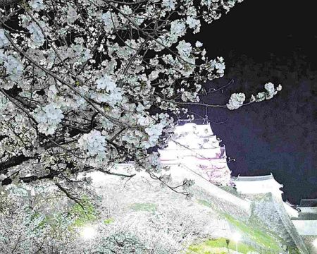 FUKUOKA — Blossoms of about 1,000 cherry trees are lit up with the “keep” of Fukuoka Castle in th...
