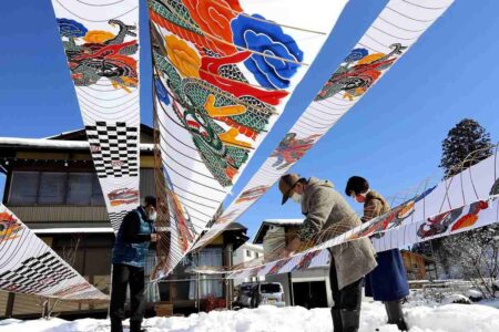 Workers air colorfully dyed cloth in a snow-covered landscape in Takayama, Gifu Prefecture. ...