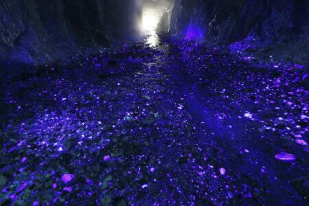 Fluorite glows blue and purple under black light at the Sasahora Mine in Gero, Gifu Prefecture, in t...