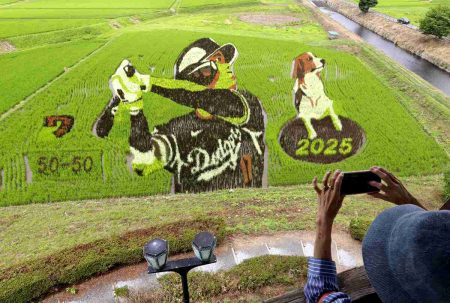 Rice paddy art depicting Los Angeles Dodgers star Shohei Ohtani and his dog Dekopin, also known a...