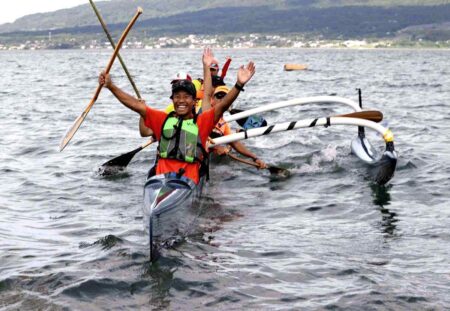 KAGOSHIMA — Volunteers from Amami Oshima Island paddled the route taken by predecessors who made a s...