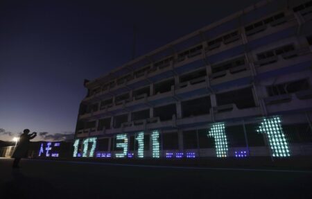 KESENNUMA, Miaygi — A message to remember Japan’s earthquakes illuminated the former building of ...