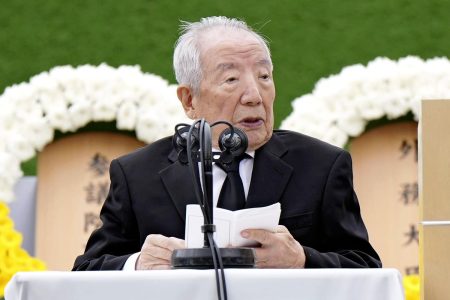 Nagasaki atomic bomb survivor Hiroshi Nishioka, 93, read out the “Pledge for Peace” at the peace ...