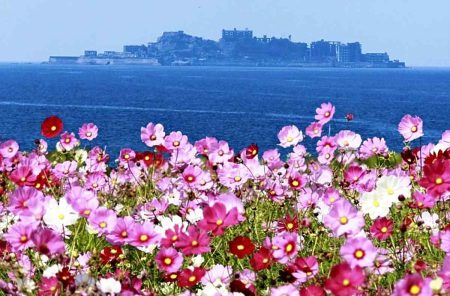 NAGASAKI — A project is underway to create a cosmos field on a hill in Nagasaki where Hashima Isl...