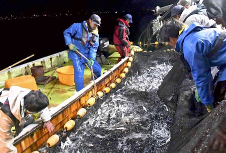 Fishermen land the year’s first catch of firefly squid off Namerikawa, Toyama Prefecture, on Sund...