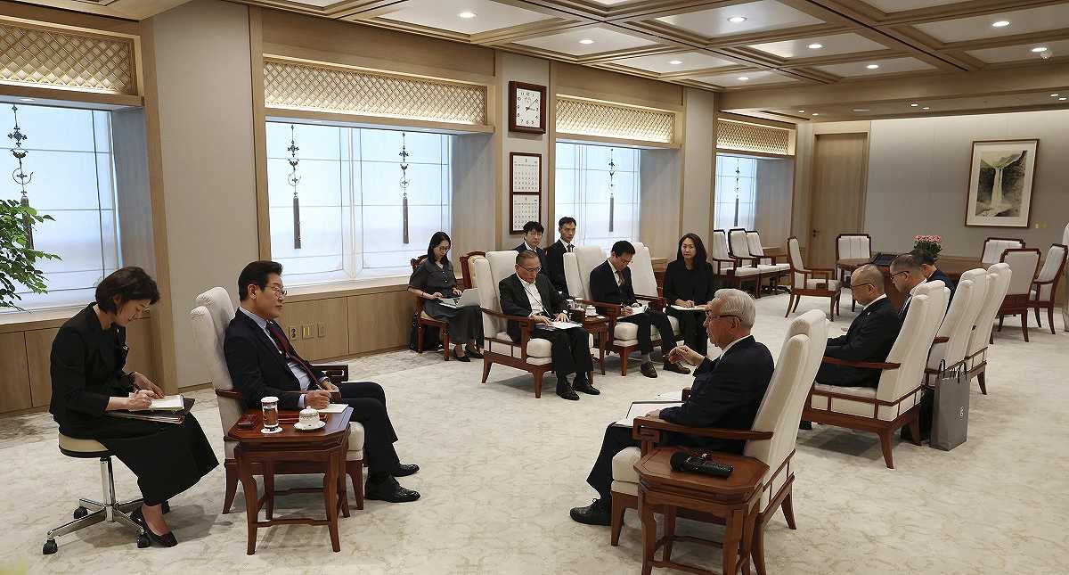 South Korean President Lee Jae Myung, second from left, speaks with Shoichi Oikawa, front right, Editor-in-chief and representative director of The Yomiuri Shimbun Holdings, as reporters listen on in Seoul on Tuesday.