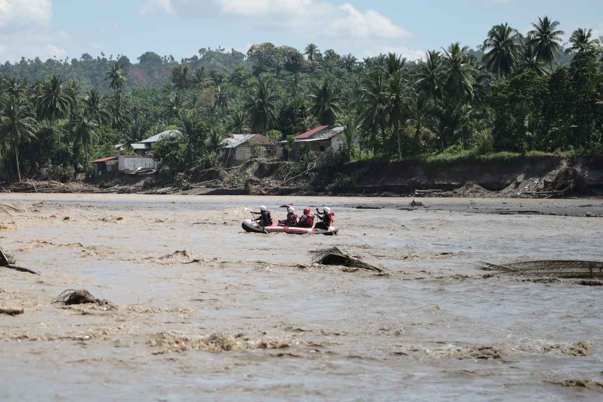 Rescuers use rubber boats to search for missing people in a flooded area in Bireun in Aceh Province, Indonesia on Sunday.