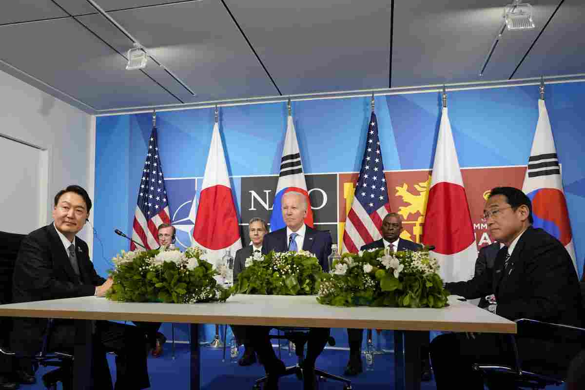 President Joe Biden, center, meets with South Korea’s President Yoon Suk Yeol, left, and Japan’s Prime Minister Fumio Kishida, right, during the NATO summit in Madrid on Wednesday.