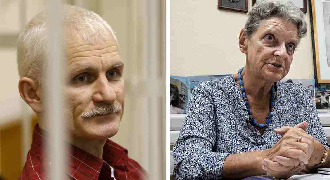 Left: Ales Bialiatski, the head of Belarusian Vyasna rights group, stands in a defendants’ cage during a court session in Minsk on Nov. 2, 2011. Right: Svetlana Gannushkina, a member of the council of Russian human rights organization Memorial, speaks to journalists in Moscow in August 2021.