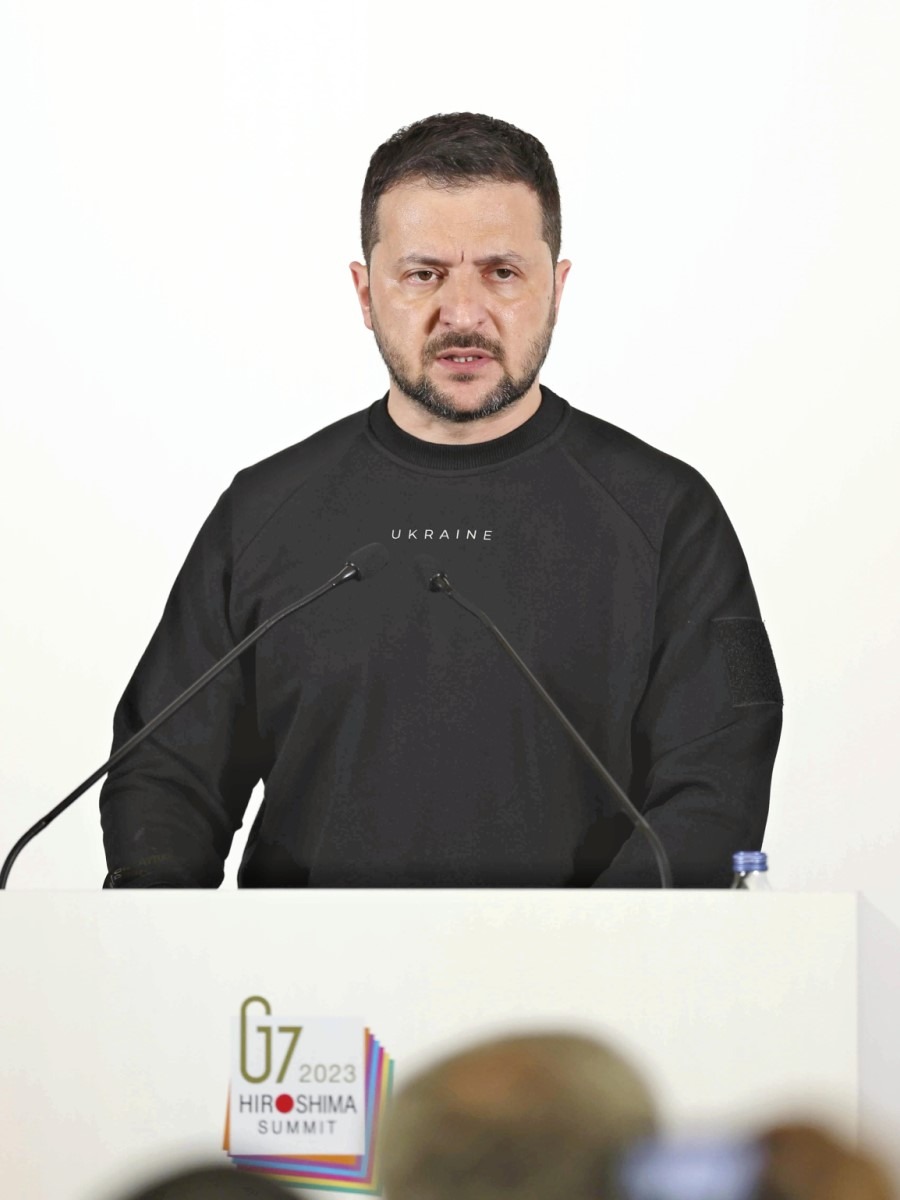 Ukrainian President Volodymyr Zelenskyy speaks at a press conference in Hiroshima on Sunday.
