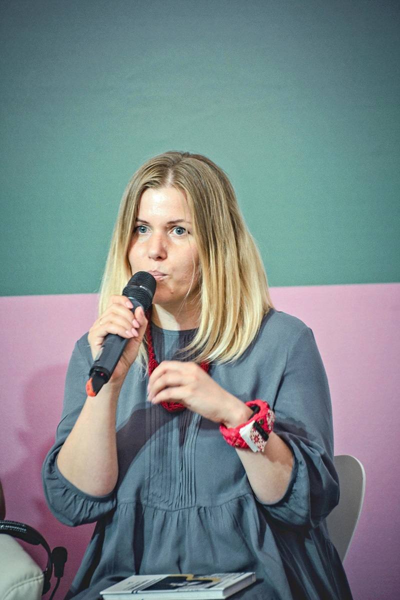 Olena Rybka speaks at a book fair held in Kyiv in June 2023.