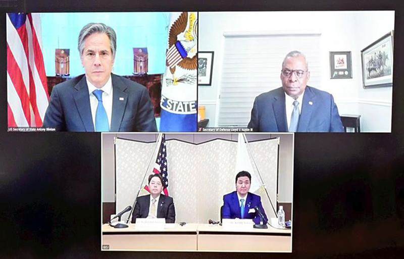 Clockwise from upper left, U.S. Secretary of State Antony Blinken, U.S. Defense Secretary Lloyd Austin, Defense Minister Nobuo Kishi and Foreign Minister Yoshimasa Hayashi attend the Japan-U.S. two-plus-two meeting via video conference.