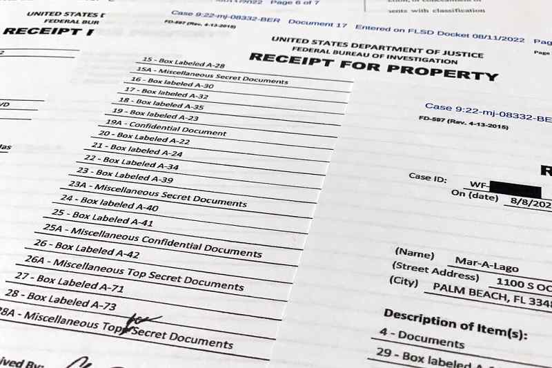 The receipt for property that was seized during the execution of a search warrant by the FBI at former President Donald Trump’s Mar-a-Lago estate in Palm Beach, Fla., is photographed Friday, Aug. 12, 2022.