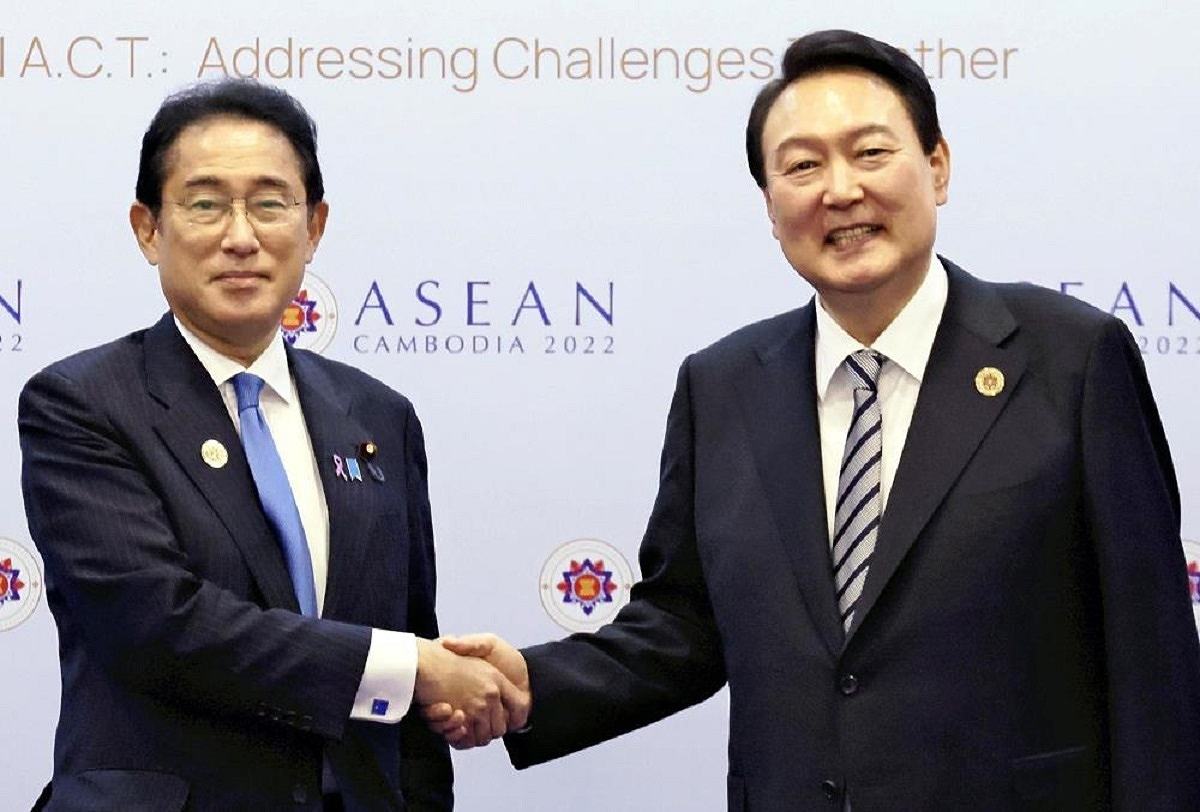 Prime Minister Fumio Kishida, left, and South Korean President Yoon Suk-yeol shake hands in Phnom Penh on Nov. 13.