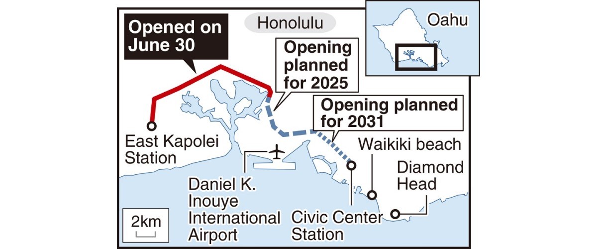 The entire line is scheduled to open in 2031. The about 30-kilometer line will eventually connect the western part of Oahu to central Honolulu in 39 minutes via 19 stations, including Daniel K. Inouye International Airport Station. The Skyline is the first train service operated by an automated driving system in the United States and runs mainly on elevated tracks.