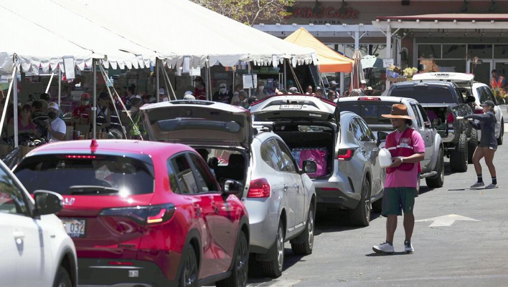 Vehicles wait in line to collect relief supplies in Lahaina on the island of Maui in Hawaii, on Saturday.