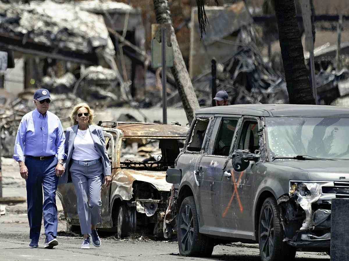 U.S. President Joe Biden and first lady Jill Biden tour areas devastated by wildfires in Lahaina, Hawaii, on Monday.